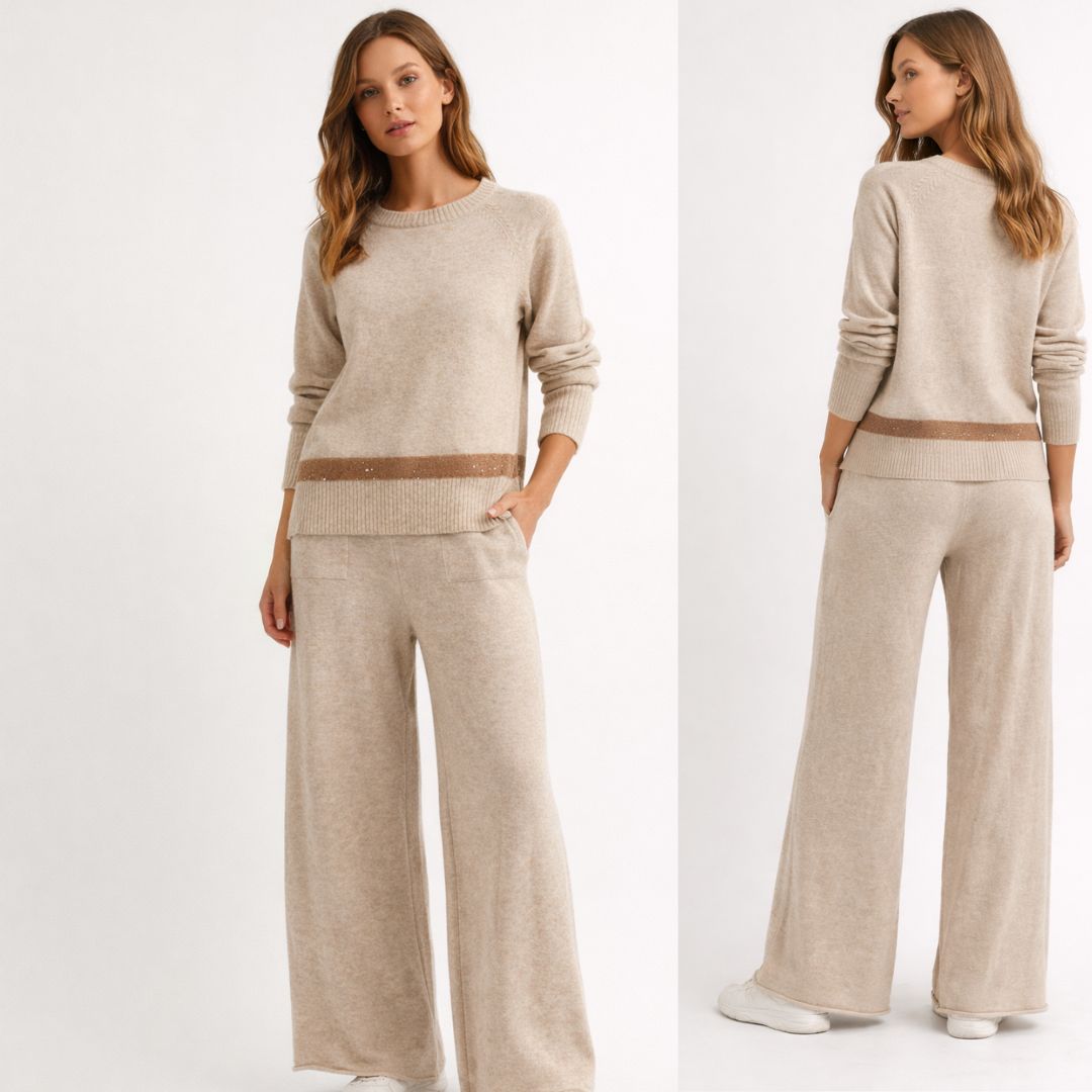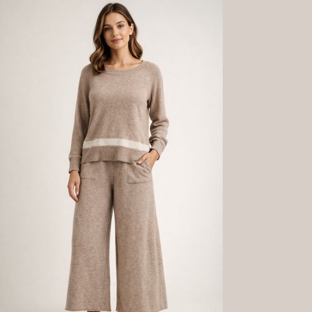 Bež trikotažni komplet sa širokim pantalonama