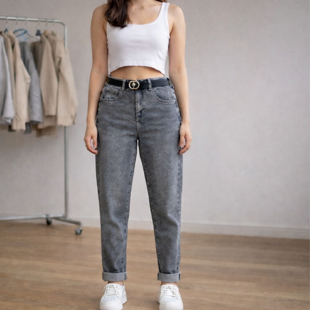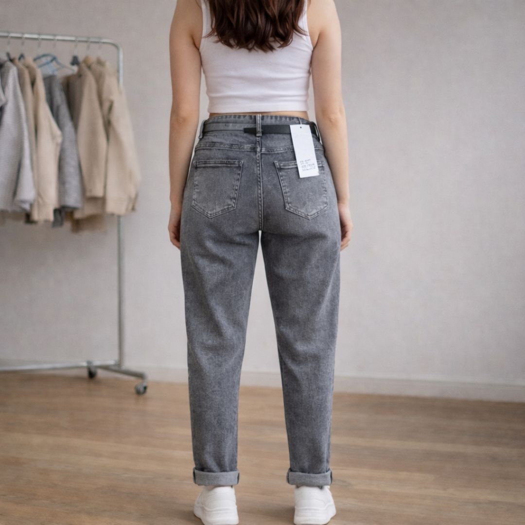 Moderne sive farmerke baggy fit kroja sa visokim strukom, dizajnirane za opušten i trendi izgled. Širi kroj pruža maksimalnu udobnost i slobodu pokreta, dok visok struk lepo oblikuje figuru i daje moderan siluetu.